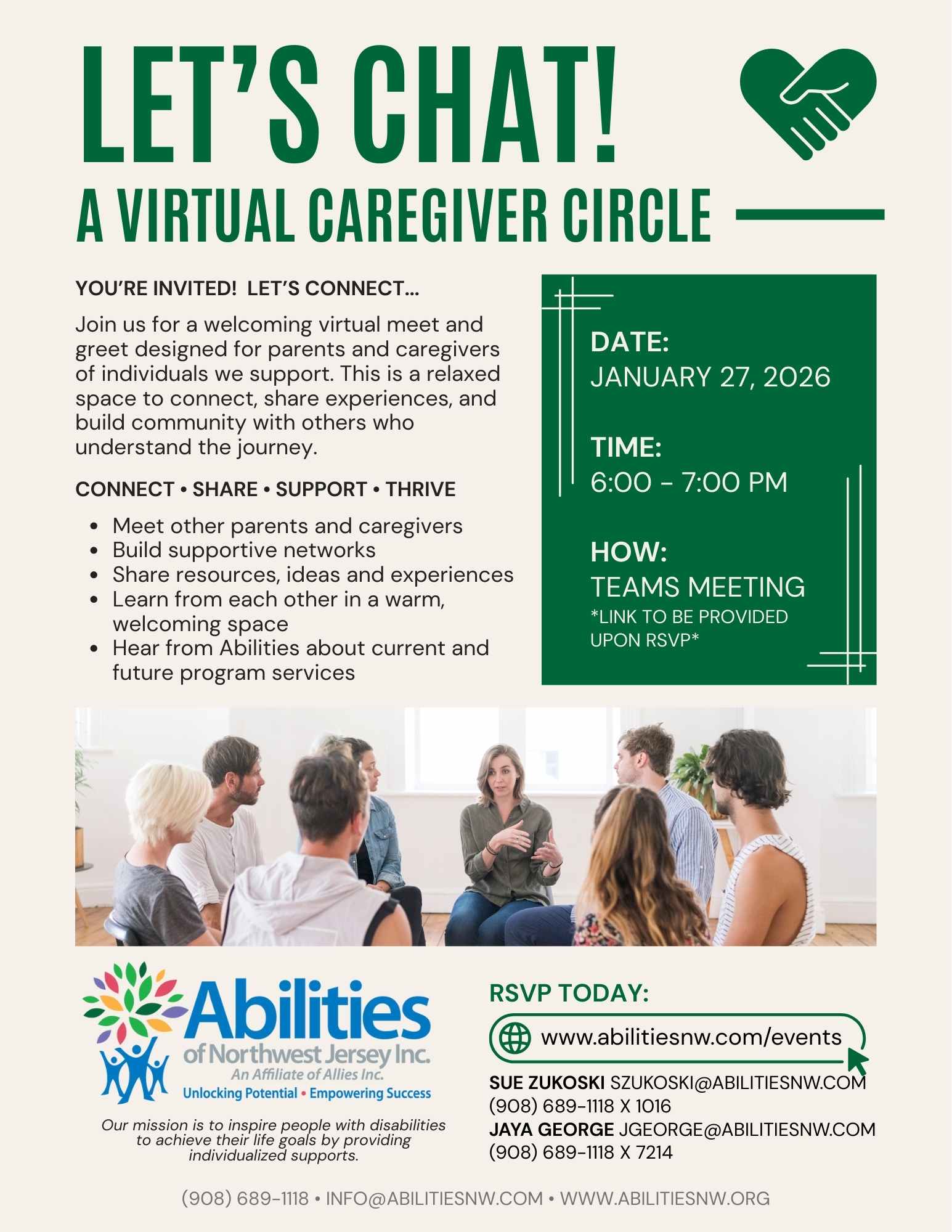 Join us for a welcoming virtual meet and greet designed for parents and caregivers of individuals we support. This is a relaxed space to connect, share experiences, and build community with others who understand the journey. Connect • Share • Support • Thrive TEAMS Meeting link will be provided upon RSVP. RSVP or for more […]