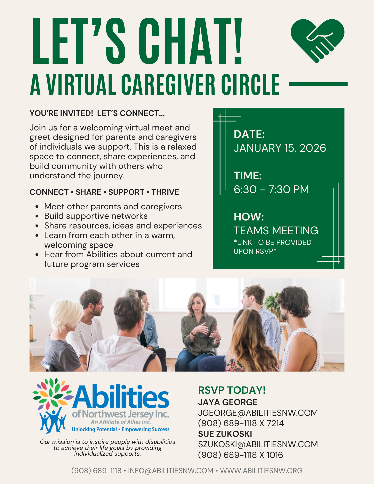 Join us for a welcoming virtual meet and greet designed for parents and caregivers of individuals we support. This is a relaxed space to connect, share experiences, and build community with others who understand the journey.